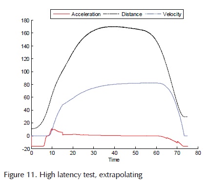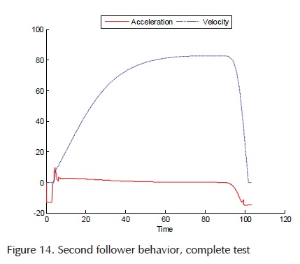In Figure 7 we can observe the behavior of the following car for a test where the leader starts moving from 0 to 80 km/h and decelerates to a complete stop, the initial distance between the vehicles was 11.14 m, with ΔT = Is and extrapolating. The test is conducted in the same way without extrapolation with the results in Figure 8, where it can be observed the acceleration abrupt changes.
