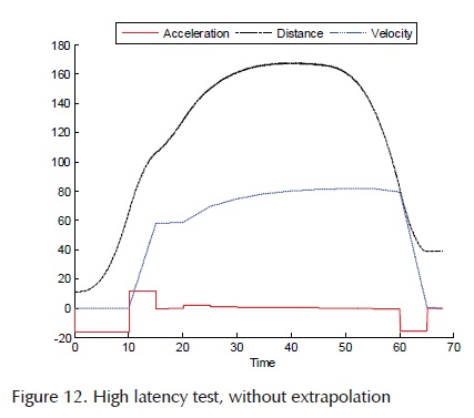 Figure 11 presents the extreme case with ΔT = 5 s and the leader going from 0 to 80 km/h; then gradually decelerating until it is at rest. It can be observed that the extrapolation procedure maintains a more realistic behavior than without extrapolating, as in Figure 12.