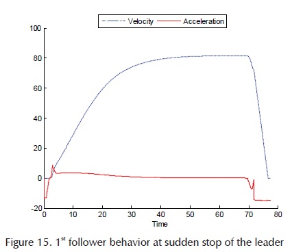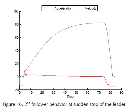 The behavior of the first follower at a sudden stop of the leader going at 80 km/h is presented in Figure 15, Figure 16 shows the second follower behavior, the experiment with ΔT = 1 s.