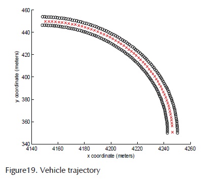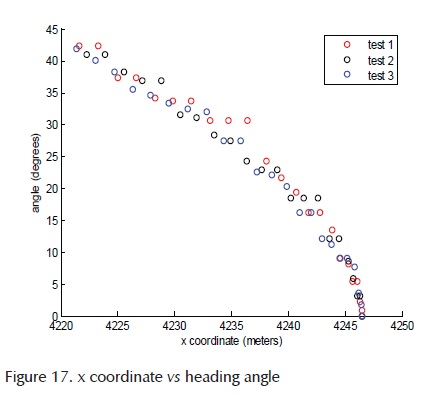 Figure 17 shows that the vehicle begins with the heading angle θ = 0 and moves from right to left. In Figure 18 the vehicle speed is decreasing as the time increases, the speed became constant at approximately t = 5.5 s, i.e. when the desired speed is reached. With the data obtained from the tests the model that relates the heading angle with the position is obtained, subsequently with the vehicle position the time is explained, finally the model that explains the speed on curves with time as the independent variable is obtained. Three tests for each curve were conducted, Table 2 presents the approximate required time for each curve test.