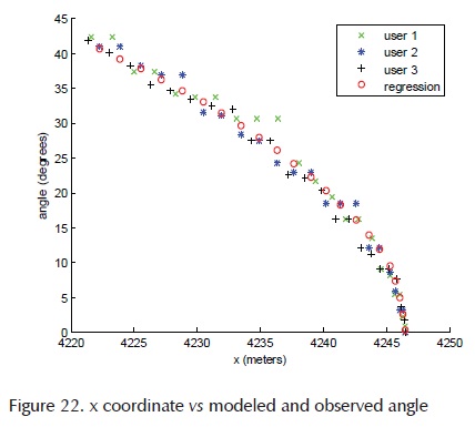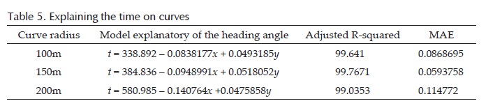 The coordinates of the vehicle position on a curve are used as the independent variable to explain the time, see Table 5. The time is employed as the independent variable for explaining the turning speed of the autonomous vehicles, observe Table 6. Figure 22 presents the x coordinate vs. the modeled angle and the observed angle from tests, Figure 23 shows the time vs. the modeled speed and the speed from tests, in both cases for a radius curve of 100 m as example.