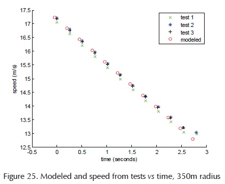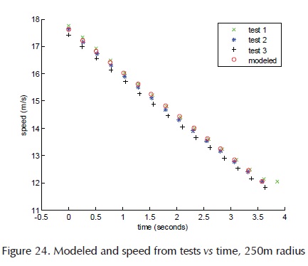 Table 10 contains the equivalent model in Table 8 where the coefficient c1 is determined as the average entrance speed of the tests for each curve case, the second coefficient c2 is obtained with the model in Table 9, then the r-squared obtained for three cases is presented. The observed data is compared with the model that predicts the turning speed using the coefficient obtained in Table 9. Figure 24 shows the time vs the observed and modeled speed for a 250 m radius curve, the same as in Figure 25 for a 300 m radius curve.