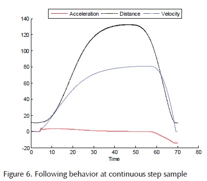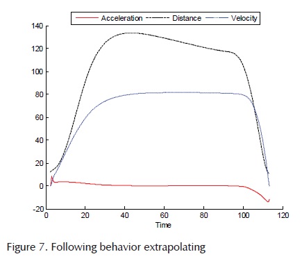The proposed model in Equation 8 was tested for behavioral analysis using a typical configuration of the car with 4 m/s2 (14.4 km/h/s) for maximum acceleration and -4.5 m/s2 (-16.2 km/h/s) for maximum deceleration, ΔT varies and is the time step at the obtained vehicles position coordinates. In Figure 5, the leader car is 200 meters from the follower, then we observed the variables -acceleration, velocity and distance- of the follower to reach the leader, with ΔT = Is and applying extrapolation between the intervals of time. Figure 6 presents the case considering ΔT = 0, i.e. the data of the leader is used at the time step at which the simulator is running, in this case, extrapolation results redundant. The leader car departs from 0 to 80 km/h and employs the model presented in Equation 1. The units of the plots from here to the end of the subsection are distance in meters, velocity in km/h and acceleration in km/h/s, the horizontal axis shows the time in seconds.
