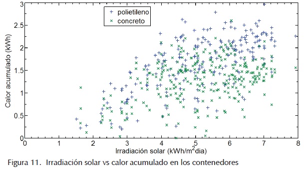En general, a lo largo del año el depósito de polietileno siempre acumuló mayor calor que el de concreto, con un orden predominante de 1.5-3 kWh, mientras que el de concreto se mantuvo entre 1-2 kWh, como se aprecia en la figura 11 . Se observa que a valores de irradiación solar menores a 3 kWh/m2/día hay valores similares de almacenaje de la energía en ambos depósitos, mientras que a mayor energía se tiene mayor almacenaje en el sistema plástico que en el de concreto. Estos resultados coinciden con lo observado en el análisis de temperaturas, donde el depósito de polietileno tiende a contener agua más caliente disponible, lo cual es resultado de ser capaz de almacenar más energía. Igualmente se puede apreciar que, de los dos depósitos, el de concreto tiende a ser más homogéneo en su capacidad de almacenamiento de energía.