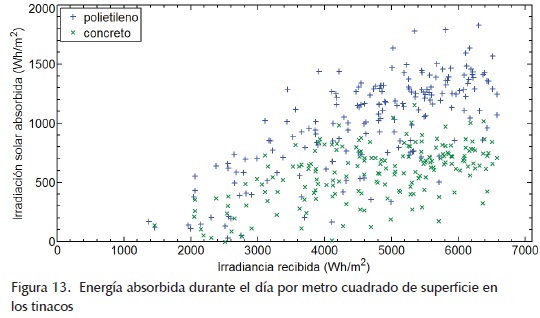 Como cada tinaco tiene una columna de agua diferente, el área de exposición también es diferente (el tinaco de concreto tiene 2.08 m2 en contacto con la columna de agua, mientras que el de polietileno tiene 1.67 m2). La división de la energía absorbida entre el área expuesta permite resultados que no dependen directamente del área. En este caso, como se aprecia en la figura 13, se ha visto que de los dos tinacos, el de polietileno tiende a absorber una mayor cantidad de energía por metro cuadrado de superficie durante el día.