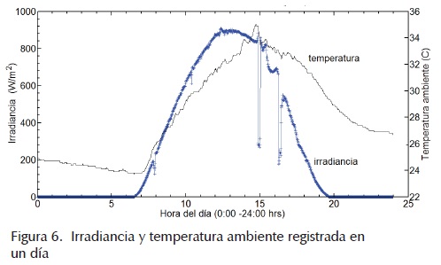 Respecto a las temperaturas ambiente mostradas en la figura 3 , se registraron valores promedio de entre 21 y 33 °C diario, observándose un patrón de respuesta correspondiente a la irradiación solar.
