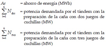 Para la zafra analizada se molió con dos juegos de cuchillas durante 56 días, para este tiempo el ahorro de energía en el tándem se puede calcular mediante la ecuación (1), teniendo en cuenta que el tándem de molinos está compuesto por seis molinos, el índice i corre desde uno hasta seis.