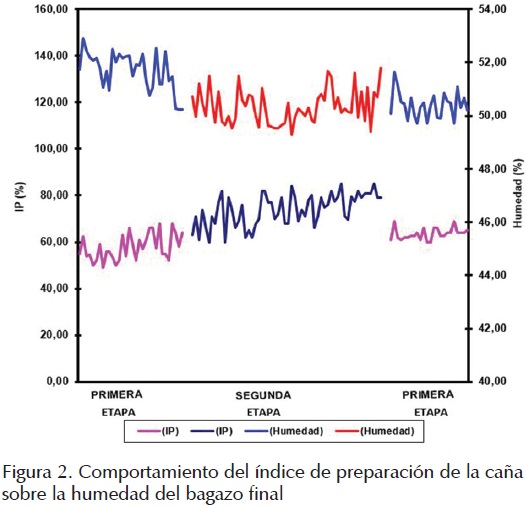 Para la preparación de la caña con dos juegos de cuchillas las humedades se comportaron dentro de un rango de 49.70% a 52.90% (figura 2). La inclusión de un tercer juego de cuchillas dio valores de humedad dentro de un rango de 49.27% a 52.40% (figura 2). En los últimos 24 días de zafra el índice de preparación disminuyó y las humedades aumentaron ligeramente hasta valores dentro del mismo rango de los primeros días de zafra (figura 2). El intervalo de confianza para la diferencia entre las medias se extiende desde 0.505698 hasta 1.08434. Puesto que este intervalo no contiene el valor cero, existe diferencia estadísticamente significativa entre las medias de las dos muestras para un nivel de confianza de 95%. Estos resultados muestran que la humedad del bagazo final tiene dependencia del índice de preparación de la caña.