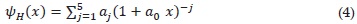 where aj are coefficients with ten significant figures, j = 0, 1, ..., 5. This approximation gives absolute errors εA, lower than |εA (x) < 7.5 × 10-8|. However, as is shown in Figure 2, the relative errors εR grow significantly with x. This can also be seen in Figure 4 , where the corresponding function ψH (·) diverge from the function obtained numerically as x grows, which means that the accuracy of the approach should be expressed in terms of its relative errors, not by its absolute error. Likewise, an inconvenience is that Eq. (4) cannot be easily inverted.