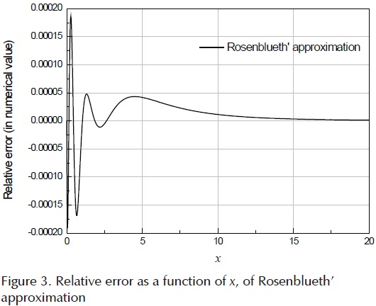 Where bi , i = 1, ..., 5, are numerical coefficients, y = x2/2, and z = 2.93 y2. As is shown in Figure 3, and according to the author, this last function leads to relative errors below |εR (x) < 4.5 × 10-5| when x>1 and relative errors are below |εR (x) < 2.0 × 10-4| over a wide interval. As it is shown in Figure 4, this approach is better than that by Hastings, because match up very closely with the numerical ones solution. However Eq. (5) can only be inverted numerically.