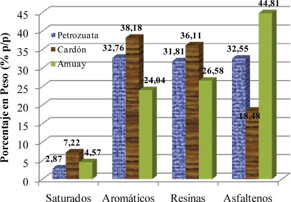 Al hacer la caracterización SARA de cada uno de los residuales de vacío venezolanos se obtiene la Figura 1 , donde se representa la cantidad en peso que contenía cada uno de los residuales preparados de las fracciones SARA. En ella se observa que ninguno de los residuales contenía más de 50% en peso de una de las fracciones de hidrocarburos, por lo que el residual debió mezclarse con concentrados de las diferentes fracciones de hidrocarburo para la obtención de los cuatro tipos de residuales base.