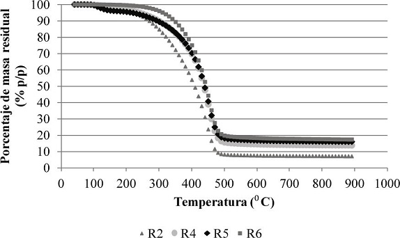 5) Termogravimetría: El termograma de los residuales preparados (Figura 2) muestra la relación que tiene la masa residual con la temperatura. Para los residuales base R2, R4, R5 y R6 se tiene que el porcentaje de masa residual (descomposición) es similar, por lo que estos cuatro residuales tienen una composición muy parecida en compuestos con temperatura de descomposición menor de 500 °C.