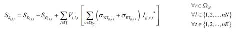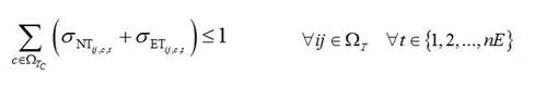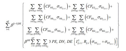 Note que los primeros seis términos de la ecuación (1) tiene una doble sumatoria, las cuales representan la localización y el tipo de un elemento, respectivamente. Respecto a la primera sumatoria, los términos tres al seis tienen solamente un subíndice, debido a que se asocia a la ubicación de subestaciones o generadores distribuidos (i o j). Por otro lado, los términos uno y dos tienen dos subíndices, debido a que se encuentran relacionados con los dos nodos de un tramo de red (ij). La segunda sumatoria en estos seis términos se asocia a la capacidad (tipo) de un tramo de red, subestación o GD (c, s o g).