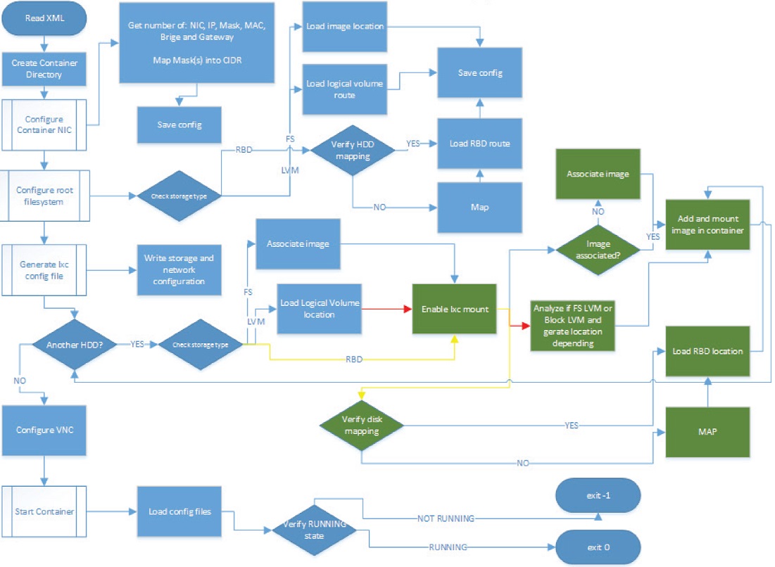 Because this driver supports three different storage types: FS, LVM and Ceph, it needs to find out which type it is and act accordingly. In case it is FS and LVM, the only thing that needs to be done is to indicate to LXC a path to the image. It is important to remember that OpenNebula uses images, either raw or qcaw, as virtual disks. LXC supports regular FS and LVM, so nothing else needs to be done, but in case the image is stored as a block device in Ceph, this image will need to be mapped in the host and provide LXC the route to where it was mapped. The reason why LXC doesn’t support Ceph’s block devices is mainly because it can’t perform this mapping action by itself, so it needs to be done by something else before the container starts. A possible approach here could be to perform this operation from OpenNebula itself. This makes sense because OpenNebula is already executing code, so the only thing that needs to be done is to write a line that tells the host to map the image. The problem with this approach is that, in case of an electrical failure or any other issue that could cause the physical host to crash, the containers that were running will not be able to start automatically. An administrator will need to manually redeploy them from OpenNebula. One of the goals wanted is precisely to avoid this, so another approach was used. The required instructions to map the root image must be executed once the host’s OS initializes. Write it inside /etc/rc.local is a possibility. Also, containers must be configured to start automatically once the OS initializes.