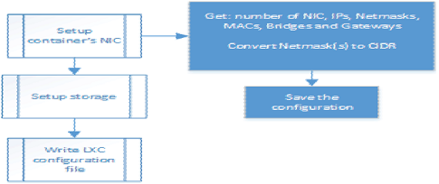 Figure 2 shows the script’s basic blocks. The first step is to read all the information that will be used from the containers template and store it in variables. Once this is done, a folder that will contain all the necessary files for the container is created with the right permissions. This folder is created inside the folder configured as the default container location in the lxc user tools, for example /var/lib/lxc in Ubuntu. In this way the containers created by OpenNebula are shown at the output of lxc-ls command, which is necessary for the driver to be able to monitor containers. Then the configuration information for the NIC is extracted, arranged and prepared inside a variable in a format that LXC’s configuration file understands. This process is simple and is shown in Figure 3. Now, the driver will proceed to configure the root storage as explained in Figure 4.
