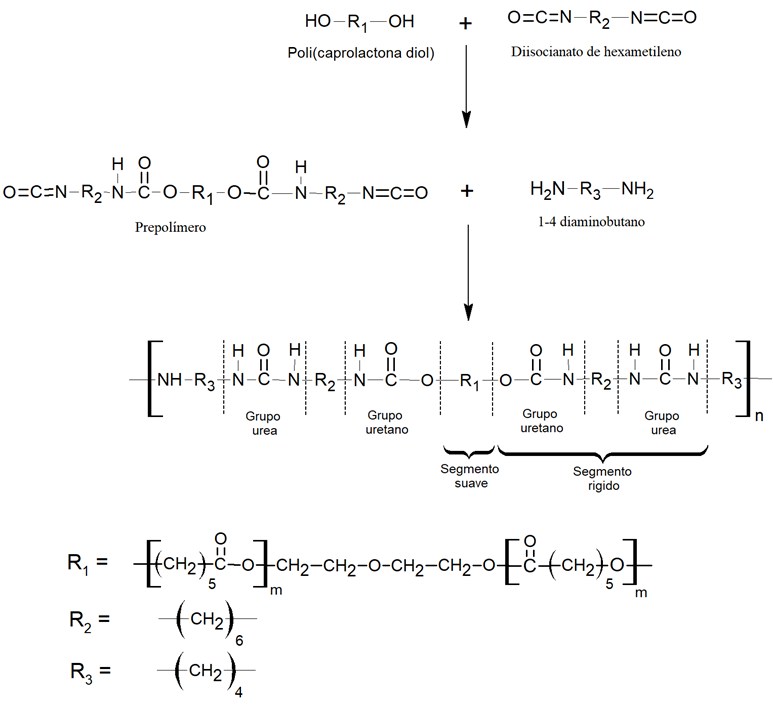 Los PUUs se sintetizaron por polimerización de dos etapas (método de prepolímero) bajo una atmósfera inerte de nitrógeno de alta pureza. Se maneja inicialmente un ligero exceso de HMDI en varias relaciones molares de HMDI/PCLDIOL >1 (1.2:1, 1.6:1, 2:1 y 2.4:1) y la reacción se mantuvo por 90 min hasta obtener el prepolímero (PCL con terminación diisocianato). La solución se enfrió a temperatura ambiente, para iniciar la etapa de extensión de la cadena, que se llevó a cabo agregando lentamente la BDA, hasta una relación estequiométrica de HMDI:PCLDIOL:BDA =1 (ejemplo, 1.2:1:0.2).