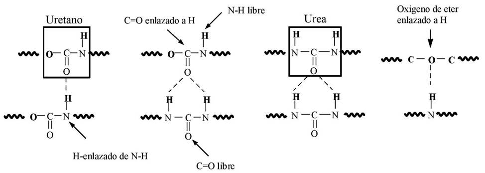 La presencia de reacciones uretano, urea, biurete y alofanatos son de naturaleza covalente y razonablemente fuertes, cuyas estabilidades dependen de los componentes y las condiciones utilizadas (Tschan et al., 2012; Kardomenos y Kresta, 1981; Wen et al., 2000). Estos segmentos causan una separación de fases como resultado de su polaridad, característica que los hace útiles en diversas aplicaciones (Jeong et al., 2000; Ahmad et al., 2004). Donde los dominios de SR actúan como entrecruzamientos físicos debido a los fuertes enlaces intermoleculares entre los grupos urea (Figura 2). Mientras tanto, sus transiciones térmicas juegan un papel importante en la flexibilidad de sus redes, y sus efectos pueden ser utilizados por conveniencia (Mackay et al., 1996; Zhang et al., 2004; Holden et al., 2004; Santerre et al., 2005; Calvo et al., 2015).