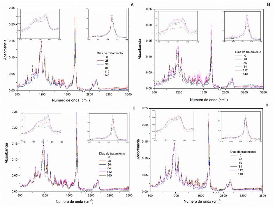 Figura 3 FTIR de muestras de PUUs degradadas en buffer salino: a) PUU14, b) PUU19, c) PUU23 y d) PUU27