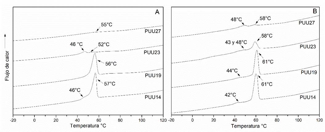 Las muestras PUU14 y PUU19, presentan un incremento en la cristalinidad respecto a las muestras PUU23 y PUU27 (Figura 4). Es evidente que el tratamiento en PBS a 37 °C, promueve la estabilidad térmica de las estructuras cristalinas, que es común en procesos de recocidos. Mayor contenido de SR promueven la formación de entrecruzamiento físicos y a su vez, la formación de microdominios que limitan la flexibilidad segmental para la cristalización de los poliuretanos.