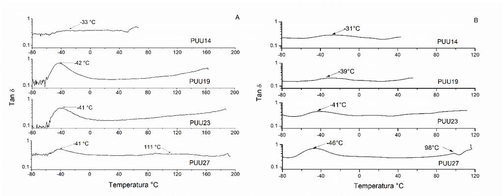 La Figura 6 presenta una relajación α asociada a la Tg de los SS, que aparece ~ -35°C, posteriores tratamientos desplazan esta transición a -40°C a diferentes porcentajes de SR. Inicialmente, se logra la dispersión de microdominios por rupturas de entrecruzamientos físicos, lograda durante la disolución al obtener las películas, lo que promovió una reducción de la cristalización de los SS conforme se incrementaban los contenidos de SR. Esto se observa en la muestra PUU14, con una reducida disipación de energía mecánica, contrario a la muestra PUU19 que alcanza la más alta disipación. Conforme se incrementa el contenido de SR, la dispersión de microdominios es más difícil, promoviendo la separación de fases, cristalizando heterogéneamente los SS y formando más microdominios los SR; que posteriormente impiden los movimientos rotacionales y traslacionales de los SS amorfos (May et al., 2011).