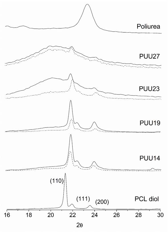 Figura 7 Difractogramas de PCL diol, poliurea y poliuretanoureas. PUU14, PUU19, PUU23 y PUU27: tratamiento 0 días (líneas gruesas) y 4 meses (líneas punteadas)