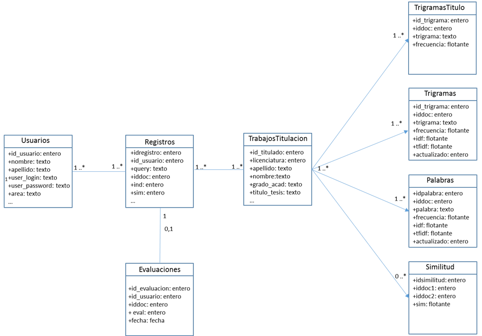 El sistema mantiene el repositorio de los trabajos de titulación (411 documentos), las relaciones de similitud entre ellos (cada uno con los otros 410 restantes), los índices invertidos generados a partir de su contenido y además almacena toda interacción del usuario con el sistema. Toda esta información se almacena en ocho tablas relacionadas (Figura 2).