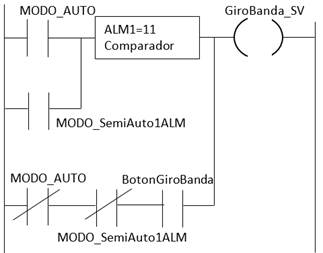 Cuando no se está en modo automático, ni la unidad específica se está probando en modo semiautomático, entonces cada actuador puede operarse manualmente con los botones virtuales designados. Por ejemplo, para activar la solenoide que produce el giro del robot cartesiano hacia la banda mediante un botón virtual se tendría la programación mostrada en la Figura 12 (notar que el botón puede sustituirse por dos botones en un circuito set-reset).