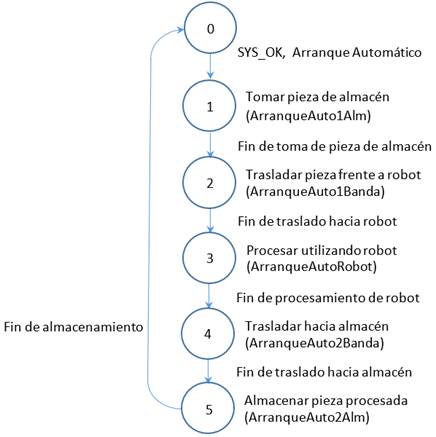 La Figura 6 muestra la máquina de estados finitos que implementa la secuencia para tomar una pieza del almacén. Una vez recibida la señal de arranque (automático o semiautomático) etiquetada como Arranque1Alm (Arranque1Alm=ArranqueAuto1Alm+ArranqueSemiAuto1Alm & NOT(MODO_AUTO)), se retrae el cilindro en la dirección Y por seguridad, se gira el robot o elevador hacia el almacén, se mueve hacia el lado izquierdo (dirección X), y luego se mueve verticalmente (dirección Z) hasta la posición deseada (LOC_PZA). Se abre la pinza, se extiende en la dirección Y para entrar y alcanzar el pallet, se cierra la pinza, se retrae en Y para extraer la pieza de la estructura del almacén, se mueve el elevador hacia la derecha, y se coloca verticalmente a la altura de la banda (BANDA). Se gira hacia la banda, se extiende para colocar pallet con pieza, se abre pinza, se retrae el cilindro volviendo así a la posición de inicio. Se decide mantener pinza abierta excepto cuando se carga el pallet que contiene la pieza.