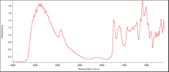 Con relación a la presencia de los grupos funcionales presentes en la base química estudiada, estos se determinaron mediante un espectro infrarrojo, el cual proporciona una serie de curvas de absorbancia, las cuales varían de acuerdo con determinadas energías de vibración características de cada tipo de enlaces químicos. Basados en la Figura 2, se puede observar la presencia de enlaces OH-, grupo perteneciente al etanol, cuya existencia es producto de su utilización como precipitante de la pectina, los cuales aparecen en un rango comprendido entre los 3600 y 3300 cm-1, asimismo, en el rango comprendido entre los 3100 y los 2900 cm-1 se evidencia una interacción carbono-hidrógeno (C-H).