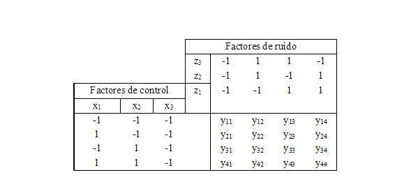 La experimentación robusta tiene sus orígenes a principios de la década de los 80 cuando Genichi Taguchi introduce el diseño de parámetros, esta metodología gira en torno al uso de un arreglo ortogonal para las variables de control conocido como arreglo interno y un arreglo ortogonal para las variables de ruido (arreglo externo) (Vuchkov y Boyadjieva, 2001). Ambos arreglos se cruzan para formar uno cruzado como se muestra en la Figura 2. Es importante señalar que no todos los experimentos de Taguchi son arreglos cruzados, en casos en que no existe interés en hacer al producto robusto, se puede correr solamente el arreglo interno sin la necesidad de agregar el arreglo externo.