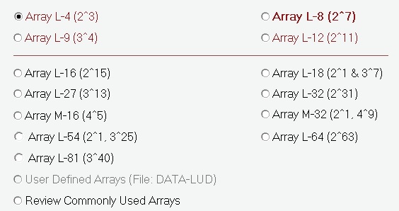 La Figura 3 es una salida del programa Qualitek-4, donde, por ejemplo, el arreglo ortogonal L32, se utiliza cuando se tienen de 16 a 31 factores y requiere 32 experimentos. En el caso en que se tienen solo 16 factores, las 15 columnas que quedan libres son normalmente asignadas para estimar interacciones. La alternativa sería correr 16+2 = 18 experimentos que permitan estimar los 16 efectos principales, la intersección y el error y dejar las 14 corridas restantes como un aumento que puede ser agregado en un paso posterior. La fracción inicial puede ser generada mediante búsqueda exhaustiva, el objetivo es encontrar las 18 corridas extraídas de un grupo de 32 que presenten los mejores niveles de D-optimalidad, ortogonalidad y balance.