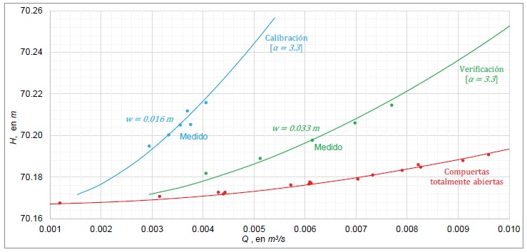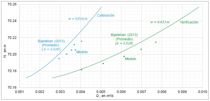donde N es el número de datos para cada apertura; para w=0.016 m, se tiene un PEAM de 2.59 % y para w=0.033 m, el PEAM es de 2.92 %; esto permite concluir que la aproximación del modelo numérico calibrado y verificado, tiene una aproximación mayor que 95 %.