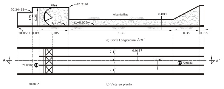 Cada una de las compuertas radiales tiene un ancho de 0.10 m, con radio de 0.12 m; la altura del perno respecto a la plantilla del canal es de 0.105 m; hay una distancia de 0.22 m entre el eje del perno de las compuertas y la entrada de las alcantarillas. Ambas pilas continúan a lo largo de las alcantarillas, y exceden la longitud de cada conducto con 0.055 m, aguas abajo. Las dos pilas forman dentro del túnel tres conductos de sección rectangular, con ancho de 0.10 m cada uno y altura de 0.083 m. La pendiente de la plantilla de las alcantarillas es de 0.002 y su longitud es de 1.70 m (Figura 4a).
