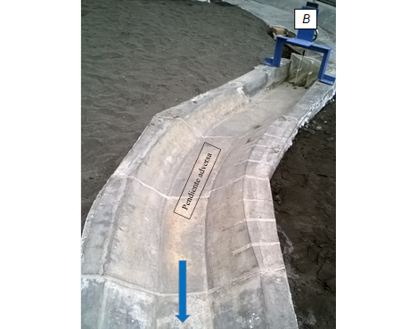 En la Figura 3 también se observa el tramo del canal que está aguas abajo de la curva horizontal; al final de este tramo se colocó una compuerta vertical plana para controlar la elevación del nivel del agua en la frontera de aguas abajo (soporte con limnímetro C).