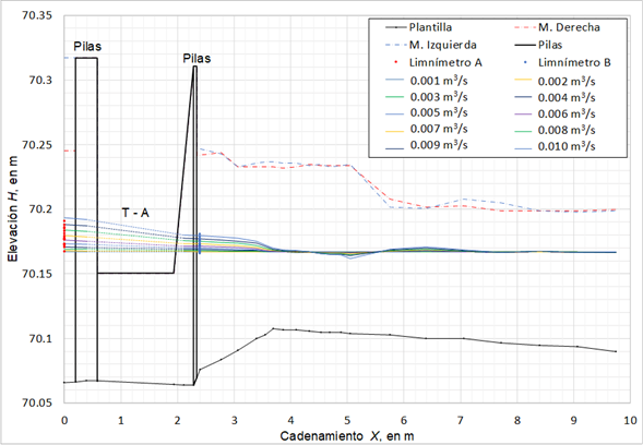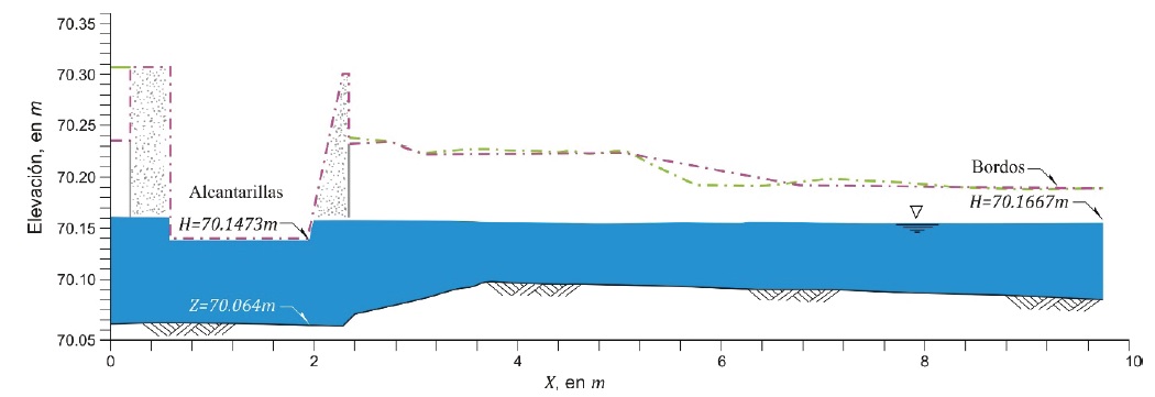 Por un lado, en el extremo final del modelo físico la elevación de la superficie libre del agua debe tener la cota H=70.1667 m; por otro lado, la elevación de la plantilla del canal en el extremo final de las alcantarillas es 70.0640 m, y como la altura de las alcantarillas es de 0.0833 m, la elevación de la clave de las mismas en la salida es de 70.1473 m (Figura 6); ahí se nota que el nivel de la superficie libre del agua, dado por la operación de la obra de toma, hace que tanto la salida de las alcantarillas, como la entrada de las mismas, sea ahogada.