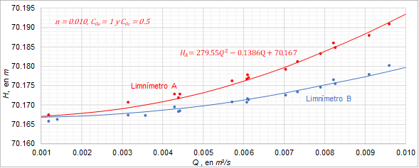 Los caudales empleados en las pruebas experimentales desarrolladas en el modelo físico se reportan en la Tabla 1; para cada gasto se registraron las cotas del agua en las secciones A, B y C. En cada prueba, se estableció flujo en régimen permanente. En la Tabla 1: Q, es el caudal calculado con la ecuación (2); HA, la elevación de la superficie libre del agua en la ubicación del limnímetro A; HB, la cota del agua en la localización del limnímetro B; y HC, el nivel del agua en la ubicación del limnímetro C.