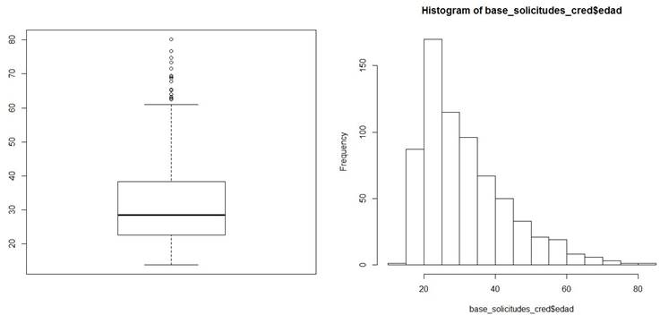 • Para la variable “Edad” (Figura 14) la mediana está en 28.46 años, el mínimo en 13.75 años, el máximo en 80.25 años y se tiene regular proporción de valores extremos (no se descartaron los 12 nulos en la variable). El histograma muestra que las edades se cargan ligeramente a la izquierda, por lo que en su mayoría se trata de solicitantes jóvenes.