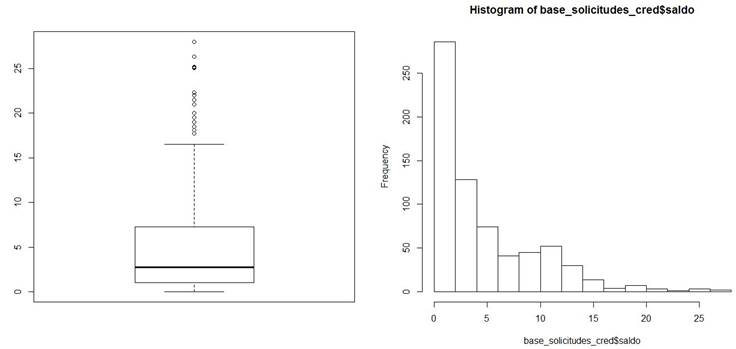 • Para la variable “Saldo” (Figura 15) la mediana está en $2.75 dólares australianos (se supone este tipo de moneda por el origen de la base de datos), el mínimo es $0.00 (es decir, hay solicitantes sin saldo), el máximo es $28.00 dólares australianos y se tiene regular proporción de valores extremos. El histograma muestra una alta concentración de solicitantes con saldos bajos.