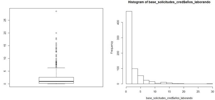 • Para la variable “Años laborando” (Figura 16) la mediana está en 1 año, el mínimo en 0 años (es decir, hay solicitantes que son clientes nuevos del banco en cuestión, ya que ni siquiera tienen un año de antigüedad con el mismo), el máximo es 28.5 años y se tienen regular proporción de valores extremos. El histograma muestra una alta concentración de solicitantes con pocos años laborando en su empleo actual.