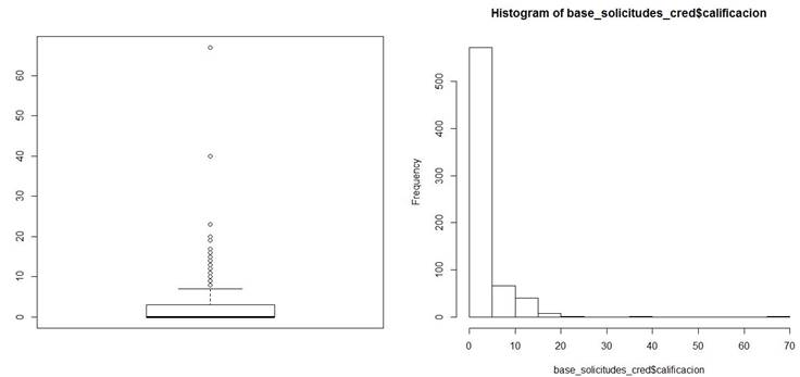 • Para la variable “Calificación” (Figura 17) la mediana y el mínimo están en 0 puntos, el máximo es 67 puntos y se tienen alta proporción de valores extremos. El histograma muestra una alta concentración de solicitantes en calificaciones bajas.