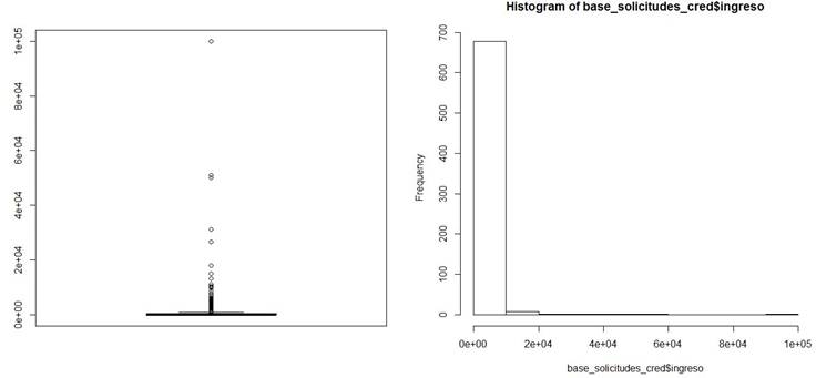 • Para la variable “Ingreso” (Figura 18) la mediana está en $5 dólares australianos, el mínimo en $0 dólares australianos (es decir, hay solicitantes que reportaron no tener ingresos, o bien, podría tratarse de un error de calidad de datos, ya que difícilmente se le daría crédito a un solicitantes sin ingresos), el máximo en $100,000.00 dólares australianos y se tiene alta proporción de valores extremos. El histograma muestra que la mayoría de los solicitantes son de ingresos bajos.