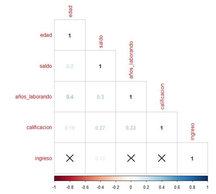 Finalmente, la Figura 19 muestra la matriz de correlación entre las variables numéricas, en la misma se observa que existe cierta correlación entre la edad y los años laborales del solicitante, así como entre el saldo y los años laborales del solicitante. Asimismo, se observa que no hay correlación entre el ingreso del solicitante y el resto de variables numéricas.