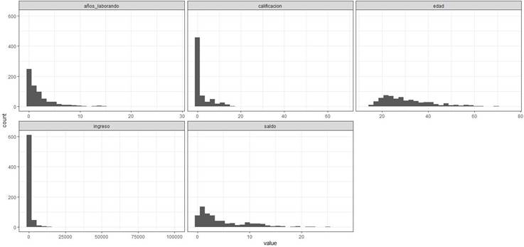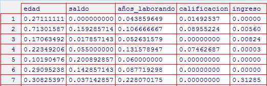 Posteriormente, se normalizan las variables numéricas: edad, saldo, años laborando, calificación e ingreso. La Figura 20 muestra la distribución de las variables sin normalizar (se observa que ninguna se parece a una distribución normal) y en la Figura 21 se muestra un fragmento de las variables normalizadas.