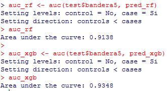 La Figura 23 muestra el AUC (área bajo la curva, métrica que mide la precisión de un modelo donde entre más cercano se encuentre a uno se considera que el modelo es más preciso) de los modelos Random Forest y XGBoost (en ambos casos sobre la base de validación) donde se observa que el modelo XGBoost tiene un AUC mayor al modelo Random Forest.