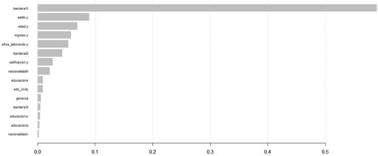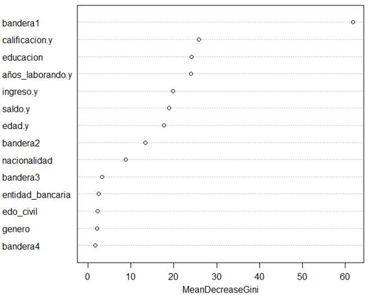 La Figura 24 muestra la importancia de predictores (es decir, cuáles son los predictores que más pesan para decidir si a una solicitud se le dará tarjeta de crédito en este caso) de acuerdo con el modelo Random Forest, donde se observa que “bandera1” (indica si el solicitante ya aplicó previamente para una tarjeta de crédito) es el predictor que pesa más.