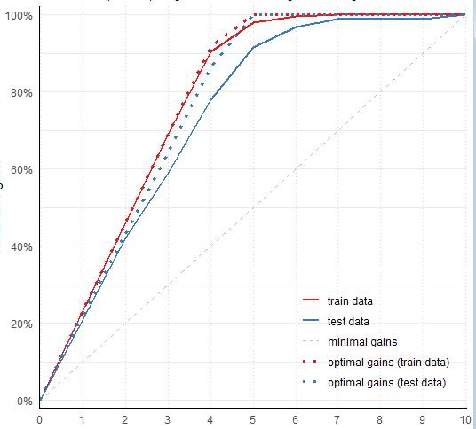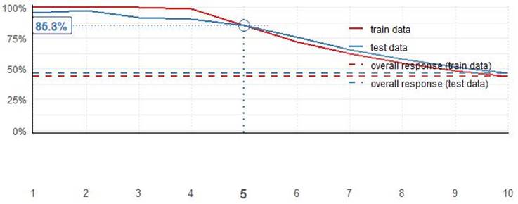 La Figura 27 responde la segunda pregunta mediante una curva de respuesta acumulada, donde se indica que el porcentaje de respuesta (solicitudes a las que se otorga una tarjeta de crédito en este caso) en la base de validación al considerar los 5 deciles con mayor probabilidad, de acuerdo con el modelo XGBoost, el porcentaje de respuesta esperada es de 85.3 %. De acuerdo con la gráfica en caso de no aplicar el modelo (líneas punteadas) el porcentaje de respuesta esperado es poco menor a 50 %.