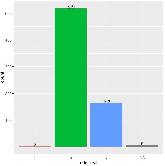 Estado civil Se imputará con la moda (valor “u”) los 6 registros con valor faltante y se descartan los 2 registros con valor “l”(a fin de evitar que queden concentrados en la base de entrenamiento o en la de validación)