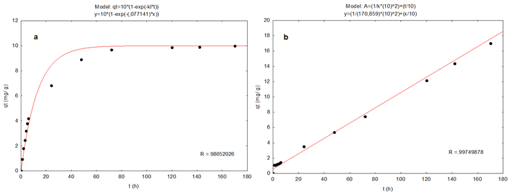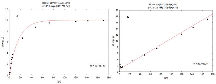 Figura 3: Ajuste de resultados experimentales del proceso de sorción de R40 sobre CACN a las ecuaciones cinéticas de: a) primer orden y b) pseudo segundo orden