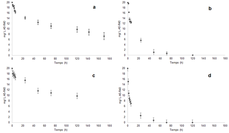 En la Figura 4 se observan los resultados obtenidos para las cinéticas de sorción en el sistema bicomponente A5-R40 en medio iónico (MI) y destilado (MD), donde se empleó CACN y carbón activado comercial (CAC). El equilibrio de sorción con el material (a) CACN-MD comenzó a partir de las 72 h (9 mg L-1), logrando una saturación total a las 170 h de tiempo de contacto (13 mg L-1). Para el material (b) CAC-MD la saturación comenzó a las 48 h (19 mg L-1), logrando una saturación total a las 120 h (20 mg L-1). El material (c) CACN-MI presentó una saturación a partir de las 48 h (8 mg L-1), la saturación total fue a las 120 h (10 mg L-1). La saturación del material (d) CAC-MI comenzó a las 48 h (19 mg L-1), logrando una saturación total a las 120 h (20 mg L-1). Por lo tanto, la capacidad de sorción en los materiales adsorbentes se llevó a cabo de manera favorable de la siguiente manera (a) ˂ (c) y (b) = (d).
