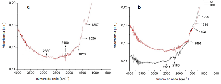 En la Figura 5b se presenta el espectro FTIR después de la sorción de los colorantes sobre los carbones activados, denominados CACN-A5 y CACN-R40 (materiales saturados con A5 y R40, respectivamente). La mejor resolución de bandas se observa entre 0.16 y 0.14 unidades arbitrarias (u.a.) de absorbancia. Entre los números de onda 1225 y 2511 cm-1 se encuentran los grupos funcionales característicos de cada uno de los colorantes, A5 y R40, indicando así que se llevó a cabo un proceso de sorción. La banda localizada en número de onda 1225-1310 cm-1 indica estiramientos C-O-C, grupos éteres, grupo funcional presente en R40 (gfpR40), a 1422 cm-1 son flexiones tipo H-C-H, como son los grupos metilos y metilenos (gfpR40), a 1595 cm-1 se llevan a cabo estiramientos de tipo C=C (sistema de anillos aromáticos), grupos funcionales presentes en A5 (gfpA5) y gfpR40. A números de onda 2180-2500 cm-1 la literatura indica la presencia de estiramientos de triple enlace, como los grupos azo (-N=N-), enlace característico de los colorantes azoicos, indicativo de la presencia de los colorantes en el material saturado (Torres et al., 2012). Así mismo, las bandas alrededor de 1422 cm-1 representan la presencia de grupos carboxílicos provenientes de los colorantes azoicos y del proceso de sorción de los mismos sobre la superficie del carbón activado. Los hallazgos anteriores se conjugan con los obtenidos de los experimentos de sorción (isotermas) indicando así que el mecanismo de sorción fue químico para ambos materiales. La baja intensidad de las bandas de absorción se debe en mayor parte a que la masa de colorante presente en la superficie de los materiales es insuficiente para obtener bandas bien definidas considerando los límites de detección del instrumento utilizado.